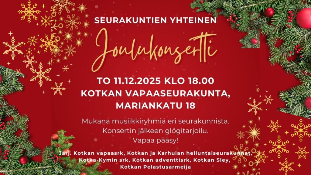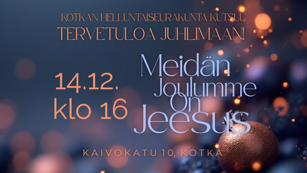 VIIKKO 50 Ti 9.12. klo 12 Päivärukouskokous Ti 9.12. klo 18 STSR Ke 10.12. klo 18 Rukous- ja ylistysilta | Jari-Pekka Rantala To 11.12. klo 18 Seurakuntien yhteinen joulukonsertti Vapaaseurakunnassa La 13.12. klo 12 Venäjänkielinen kokous Su 14.12. klo 16 Meidän joulumme on Jeesus -joulujuhla, musiikkia, puhe ja kahvit, ei pyhäkoulua